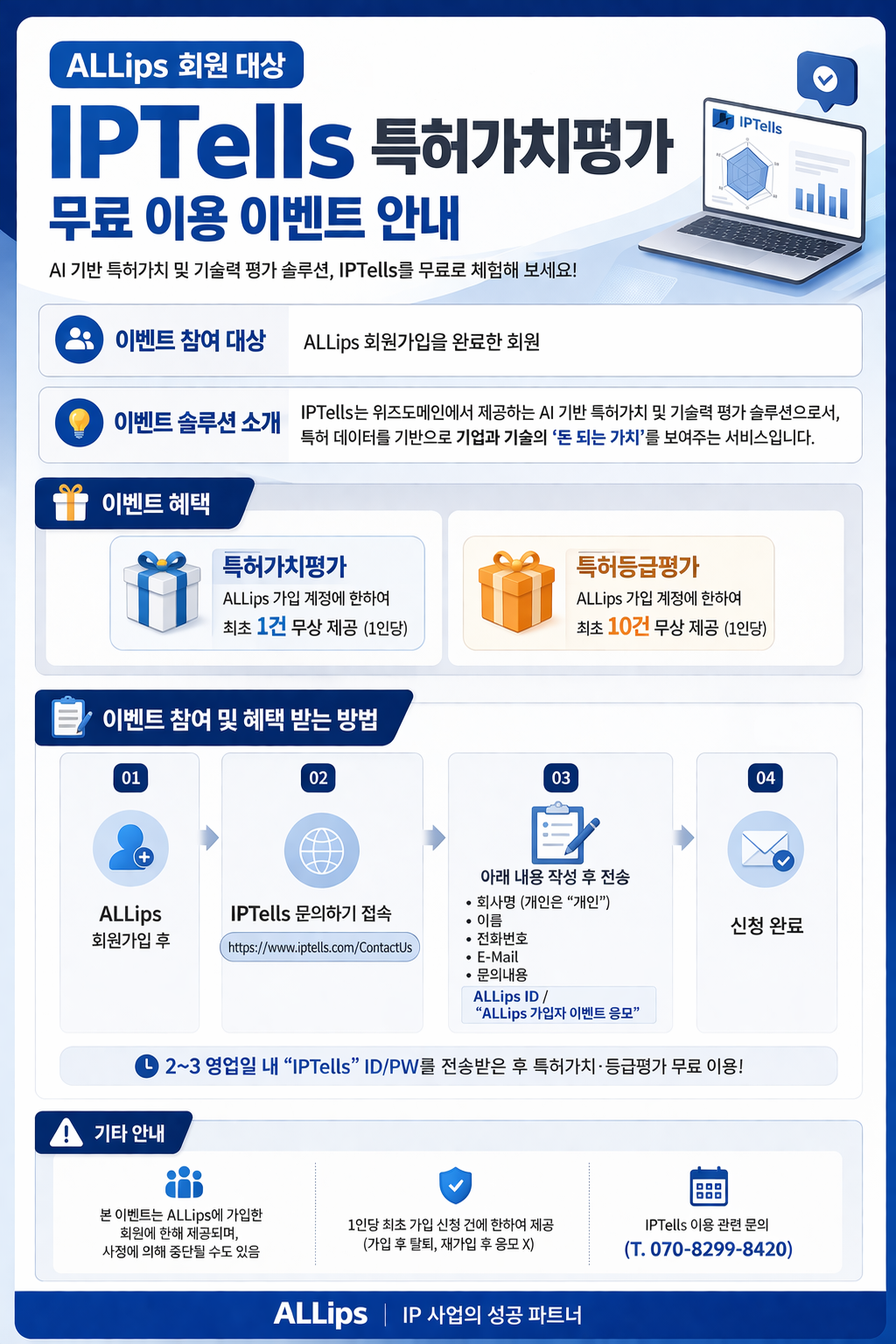 (론칭기념) ALLips 회원 대상 IPTells(특허가치평가) 무료 이용 이벤트 안내